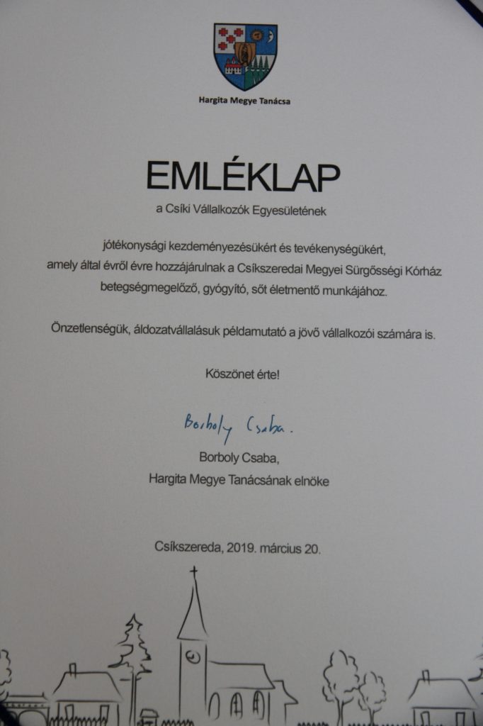 Hargita Megye Tanácsa, a Csíkszeredai Megyei Sürgősségi Kórház fenntartója emléklappal ismerte el a Csíki Vállalkozók Egyesületének jótékonysági kezdeményezését és tevékenységét. „Ezzel a tevékenységgel évről évre hozzájárulnak a csíkszeredai kórház betegségmegelőző, gyógyító, életmentő munkájához. Önzetlenségük, áldozatvállalásuk példamutató a jövő vállalkozói számára is” – emelte ki az emléklapon Borboly Csaba, Hargita Megye Tanácsának elnöke.