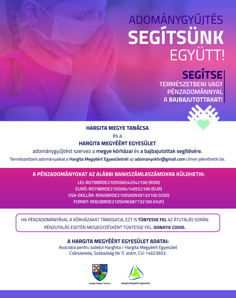 Ezért Hargita Megye Tanácsa arra kér mindenkit, hogy lehetőségeihez mérten, természetbeni vagy pénzadomány felajánlásával segítse bajba jutott embertársainkat és kórházainkat. Minden adományt szívesen veszünk, hisz ezekben a nehéz időkben égető szükség van az emberbaráti segítségre.